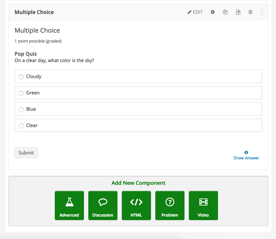 Quickly create videos, text snippets, inline discussions, and a variety of problem types.